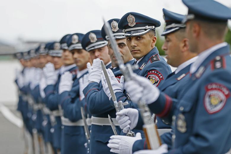 Հանդիսավոր երթից հետո ցուցադրական ելույթներ ունեցան Ոստիկանության զորքերի նվագախումբն ու պատվո պահակախումբը։