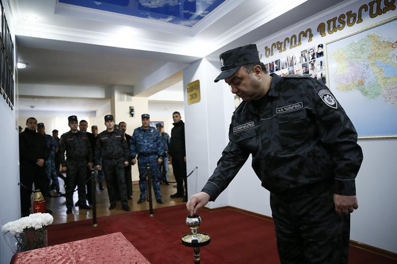 Վահե Ղազարյանը, ոստիկանության զորքերի հրամանատար Հայկ Բաբայանը և զորամասի հրամանատարությունը ծաղկեպսակ դրեցին ու ծաղիկներ խոնարհեցին հանուն հայրենիքի և ծառայողական պարտականությունները կատարելիս զոհված ոստիկանների հիշատակը հավերժացնող հուշապատին։