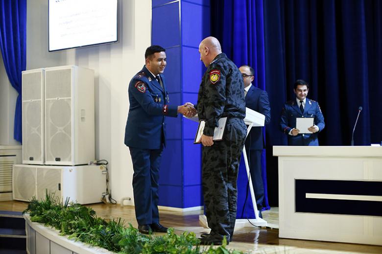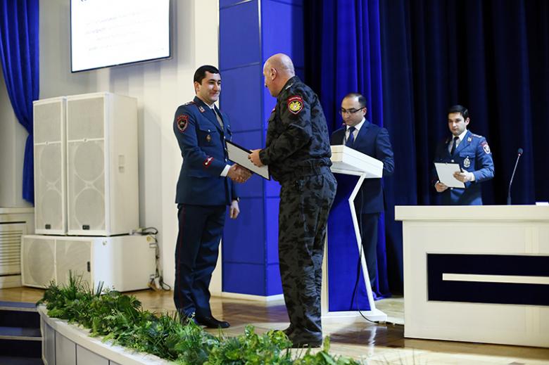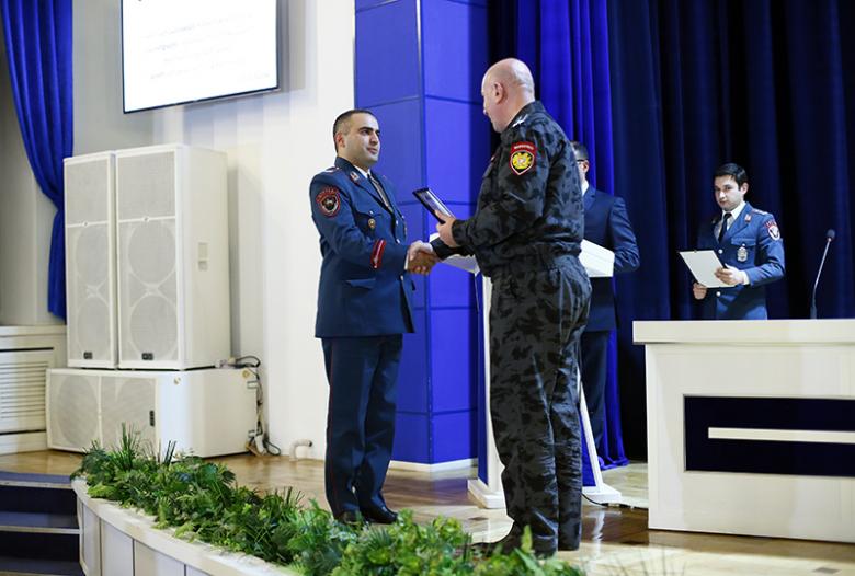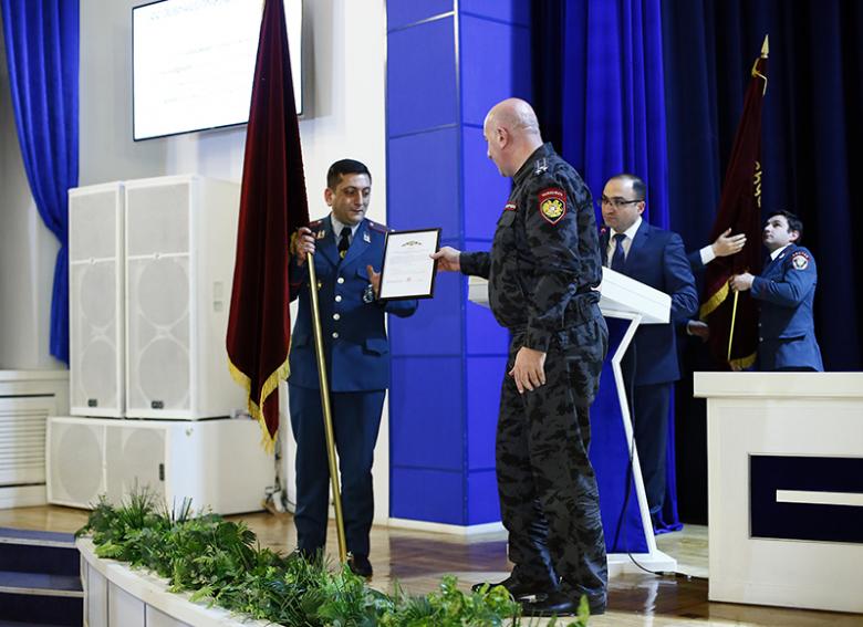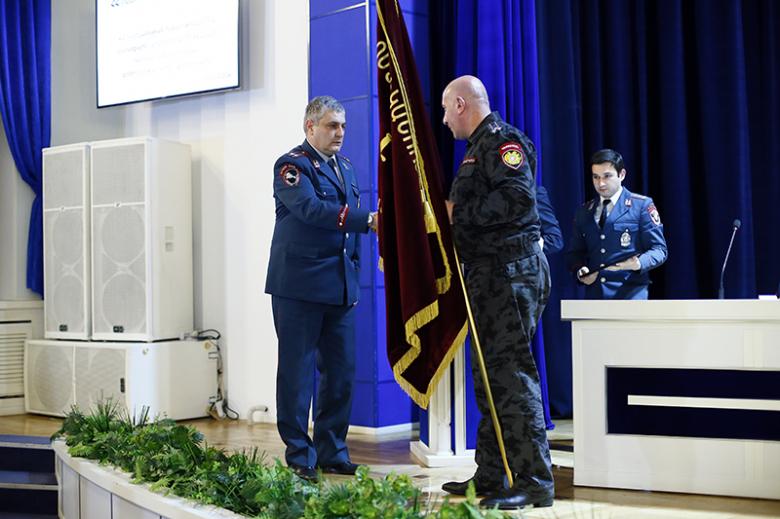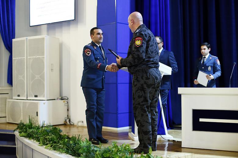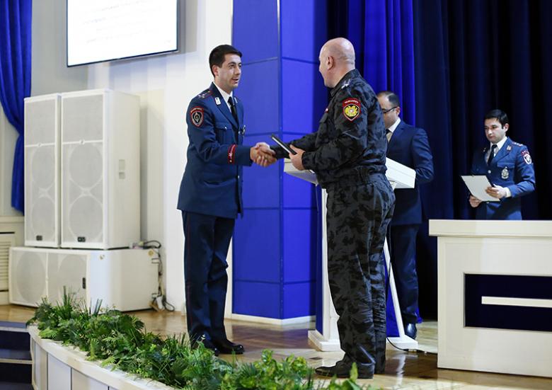 Կոլեգիայի նիստի ավարտին ոստիկանության պետի պաշտոնակատար Արման Սարգսյանը հատուկ հանձնաժողովի կողմից տարբեր ծառայությունների գծով տարվա լավագույն ճանաչված ծառայողներին ու բաժինների պետերին հանձնեց լավագույնների դրոշներն ու պարգևները։