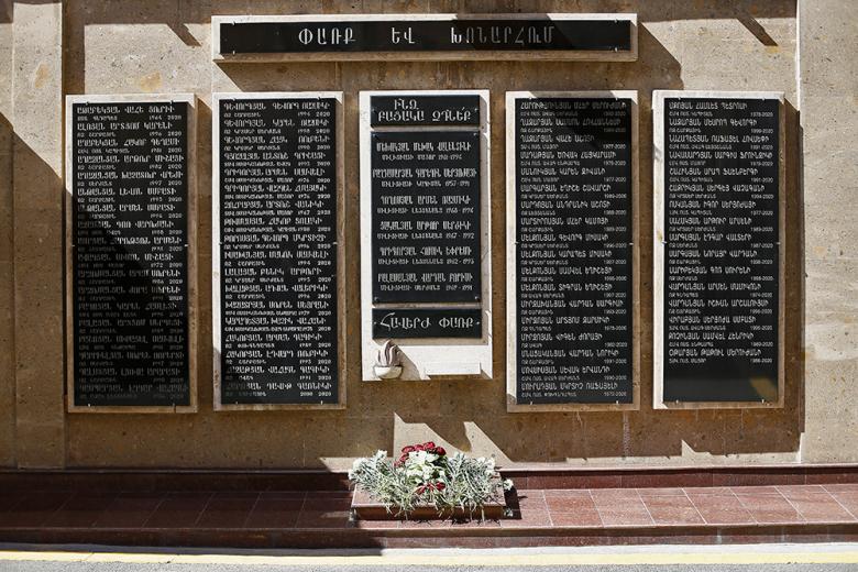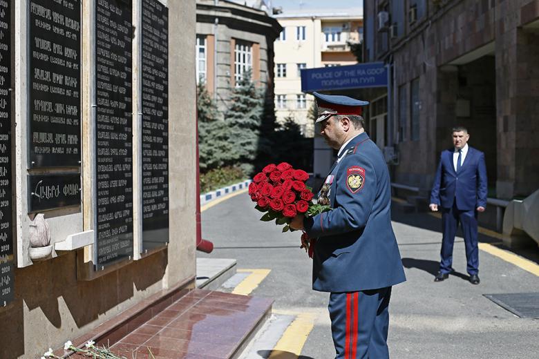 Ոստիկանության ղեկավար կազմը ծաղիկներ խոնարհեց նաև ծառայողական պարտականությունները կատարելիս և հանուն հայրենիքի զոհված Արցախյան պատերազմների մասնակից ոստիկանների հիշատակը հավերժացնող հուշարձանին: