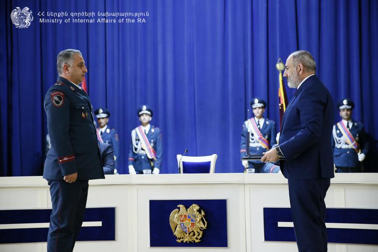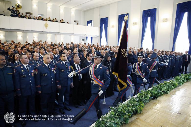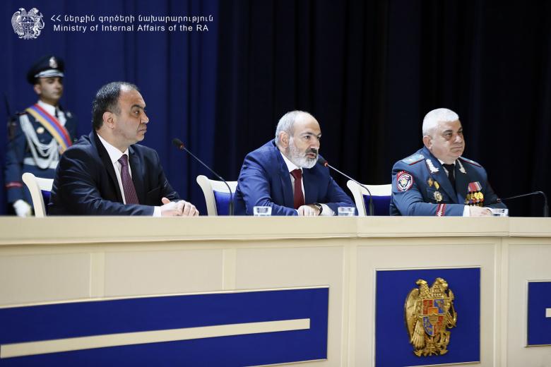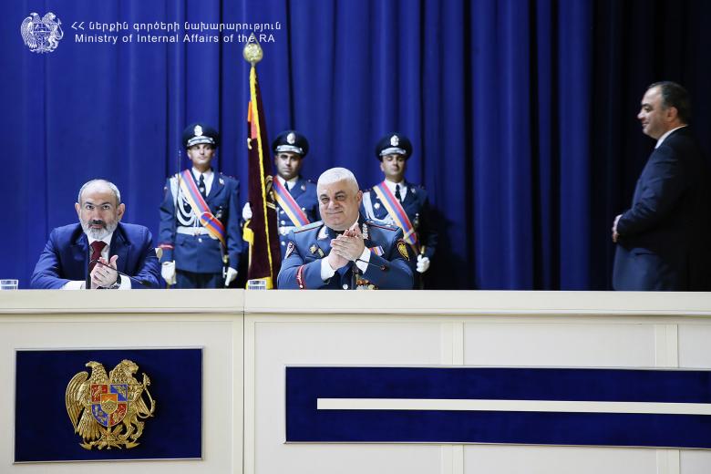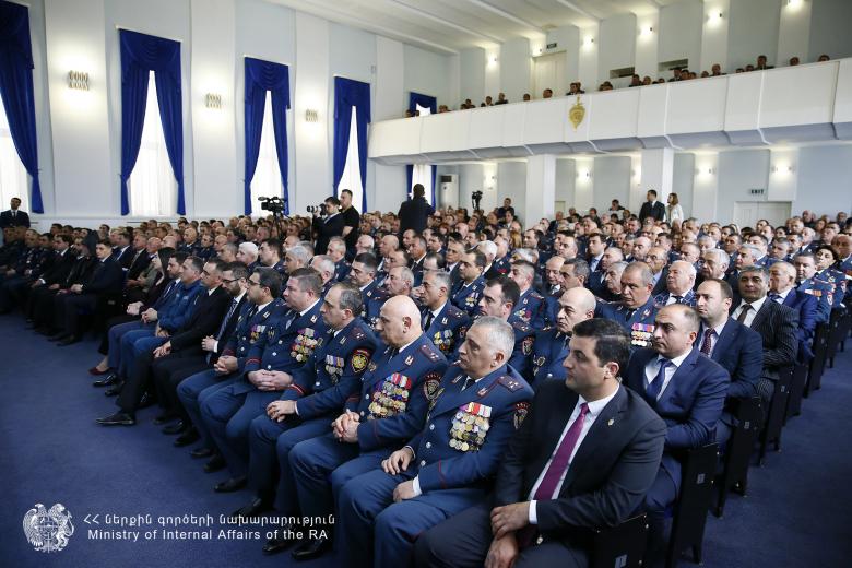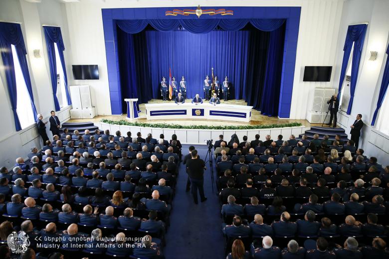 Նախ ուզում եմ բոլորիս շնորհավորել Ոստիկանության օրվա առիթով և ձեզ յուրաքանչյուրիդ և բոլորիդ շնորհակալություն հայտնել ծառայության համար, որովհետև Ոստիկանությունն այն կառույցն է, որը պետականության ողնաշարն է, և պետականության ողնաշարը պետք է ամեն օրվա հետ ավելի ուժեղ լինի: Մենք այս մասին շատ ենք խոսել. հիմա Ոստիկանությունը և ընդհանրապես, ներքին գործերի համակարգը մեծ վերափոխումների գործընթացի մեջ է: Ուզում եմ ընդգծել, թե որն է այդ փոփոխությունների առանցքային նպատակը և իմաստը: Առանցքային նպատակը և իմաստը նոր, բարձր և շարունակական բարձրացող ստանդարտներ սահմանելն է Ոստիկանության աշխատանքի համար, և ես ուզում եմ ընդգծել այս ճանապարհի երեք ուղղություն: