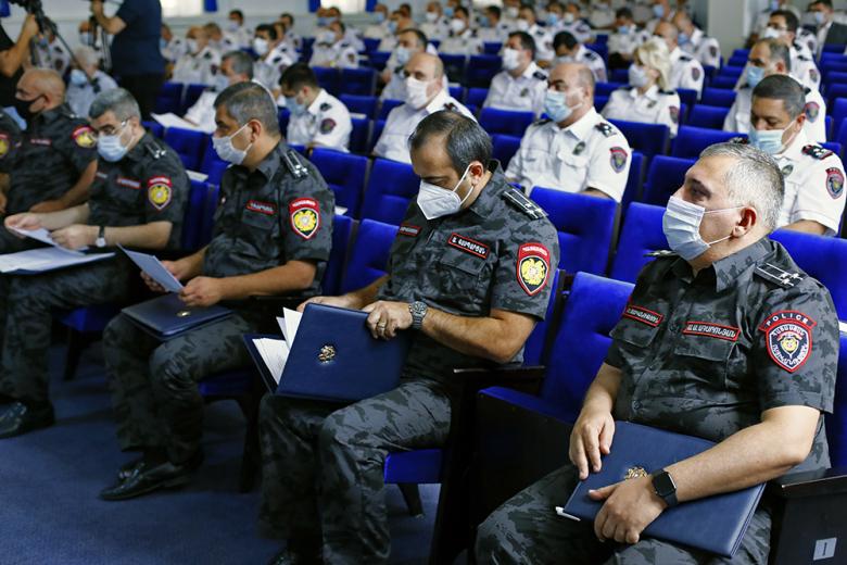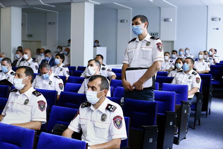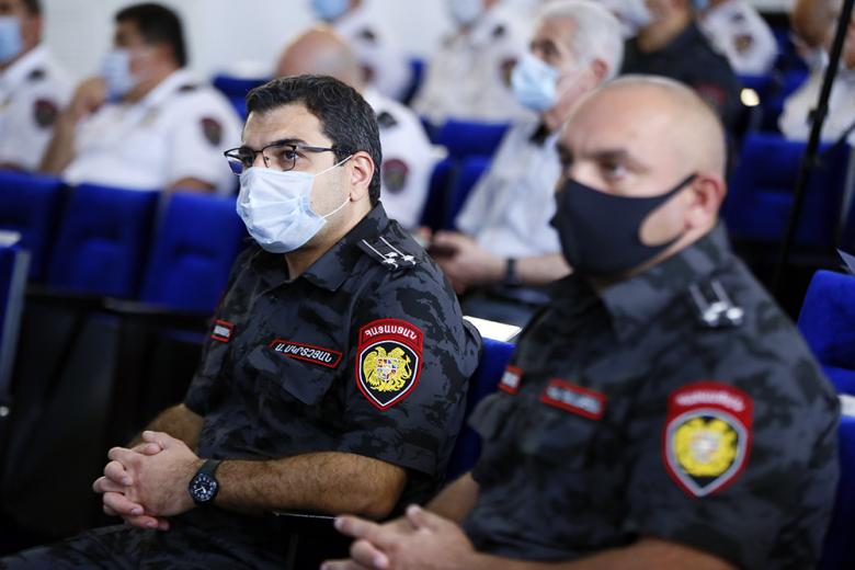Начальник Полиции Ваге Казарян выступил с заключительной речью. Сначала он поблагодарил сотрудников всех подразделений Полиции, вовлеченных в борьбу с пандемией, и поговорил о проделанной работе.