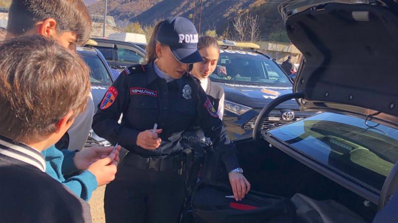 Հանդիպման ավարտին պարեկները ներկայացրել են աշակերտներին նաև գումարտակի մեքենաների լրակազմը և տեխնիկական հագեցվածությանը։
