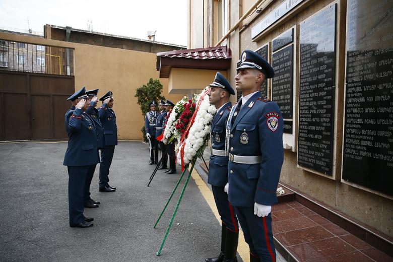ՀՀ ոստիկանության պետը, Ինտերպոլի գլխավոր քարտուղարն ու ոստիկանության կոլեգիայի անդամները ծաղկեպսակ դրեցին և ծաղիկներ խոնարհեցին ծառայողական պարտականությունները կատարելիս զոհված ոստիկանների հիշատակը հավերժացնող հուշապատին։