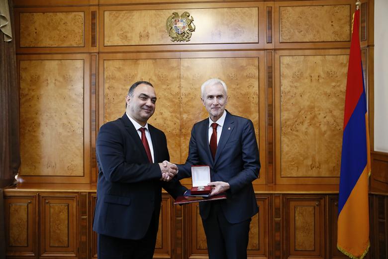 Հանդիպման ավարտին ՀՀ ոստիկանության պետ Վահե Ղազարյանը Ինտերպոլի գլխավոր քարտուղար Յուրգեն Շթոքին պարգևատրեց «Համագործակցության ամրապնդման համար» մեդալով։