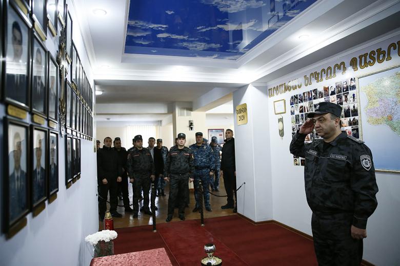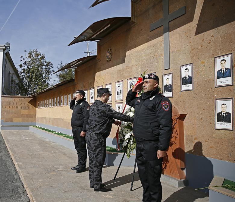 Վահե Ղազարյանը, ոստիկանության զորքերի հրամանատար Հայկ Բաբայանը և զորամասի հրամանատարությունը ծաղկեպսակ դրեցին ու ծաղիկներ խոնարհեցին հանուն հայրենիքի և ծառայողական պարտականությունները կատարելիս զոհված ոստիկանների հիշատակը հավերժացնող հուշապատին։